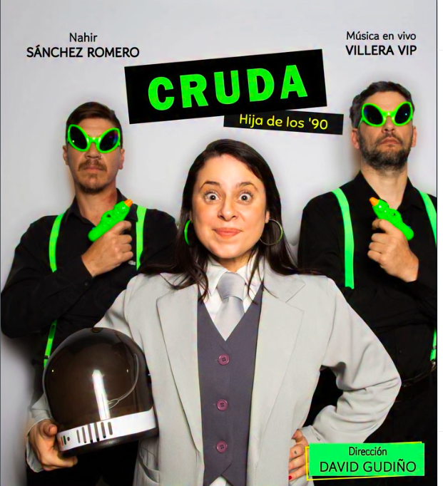 «CRUDA. Hija de los ’90» es la historia de una viajera en el espacio que se dirige hacia la estratósfera prometida y es captada por los marcianos. A través de un interrogatorio contará sin inflación, su década en el uno a uno. Entre canciones desgarradas y coloridas, ropa de feria y altares de santos infinitos expondrá a los seres verdes su herida abierta.